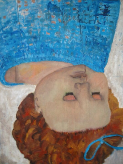 A still life painting of a doll with eyes shut. I loved drawing and painting this doll upside down and many people have tried to turn it around but it just doesn't work that way.