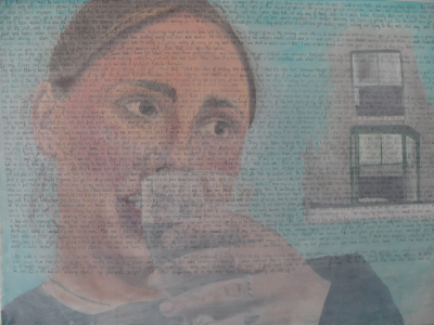 oil on canvas My daughter died in 2011 after falling from a window. The text on this painting is a book that she had started to write about her life.