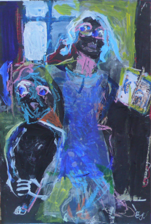 Acrylic and oil pastel on paper, 14 x 14 inches in frame.