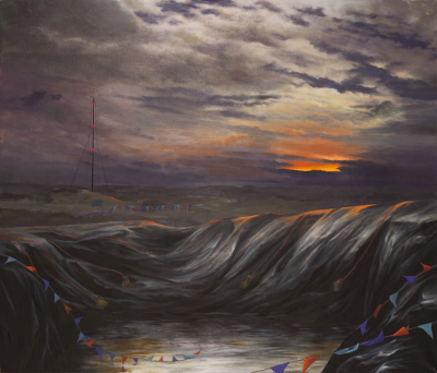 oil on linen 86x101 . This image reveals a stage in fracking where the earth's porous surface is covered in black plastic, when pit and hillock ape the larger landscape. This act of domination also manifests to me, a slick and sickly beauty. The flags of demarcation add to the ambiguity with their usual association of village fete or town festivity.