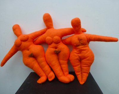 Wall hung soft sculptures representing the three ages of woman.