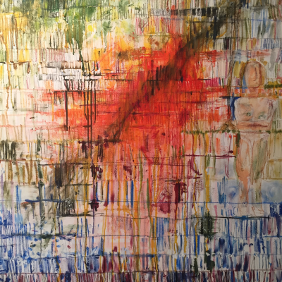 Using oils, inks, pastels and wax, the canvas has been built up with thin layers and repeated short vertical strokes, before flooding with thin glaze and scraping back to reveal under layers of colour and light.