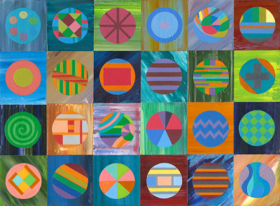 Portrait of the Artist 01 is a rare self-portrait by Ash. The structure reflects the influence that film animation and storytelling has had on her work. Here it's a vehicle for depicting different aspects of self that focus on the working of mind and what’s important rather than an outward appearance. With the division of 4 x 6 rectangles each of these 24 sections is built from thick, sensitively coloured oil paint overlayed with individual circular images. The most obvious references are to the artist’s palate, her zodiac sign Aquarius and the colours of the rainbow pride flag.