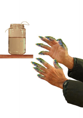 My digital illustration shows the poet's identification with the sticklebacks as totally unified. His early desire to have their colourful life is revisited as he takes on their attributes. Whether the hands are returning the jar to the shelf or taking it down is left for the viewer to decide. This openendedness extends the story that finishes with the words, 'I watched them breathe through gaping mouths, I watched them stop, grow dull and die.'